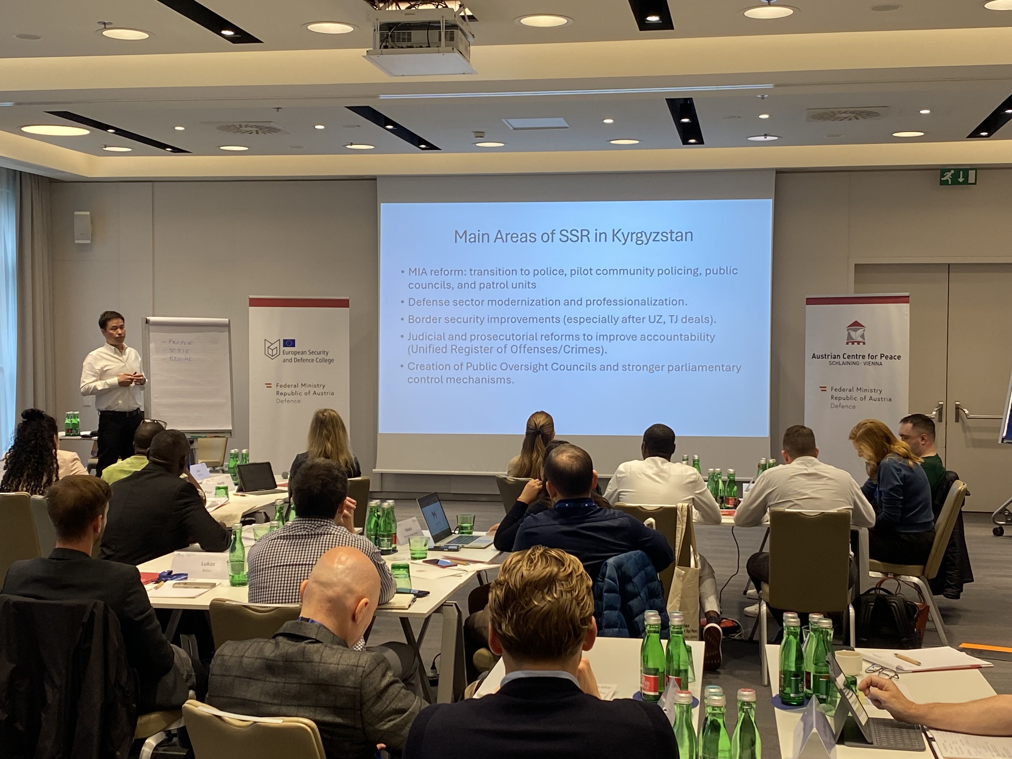 Im Rahmen der Kooperation mit dem Austrian Centre for Peace (ACP) und dem BMLV und unter der Schirmherrschaft des European Security and Defence College (ESDC) fand der "ESDC Core Course on Security Sector Reform" im Zeitraum von 03. bis 09. Oktober 2025 in WIEN statt. Seitens des BMLV ist das Zentrum für Internationale Stabilisierungsmaßnahmen, Verifikation und Rüstungskontrolle (ZSVR) mit der Kursdurchführung betraut. Insgesamt nahmen 26 Teilnehmer aus 21 Nationen am Kurs teil. 15 Trainer und Experten, darunter Vertreter von DCAF, der OSZE, OECD, NATO und EU, erläuterten das umfassende Konzept der SSR.